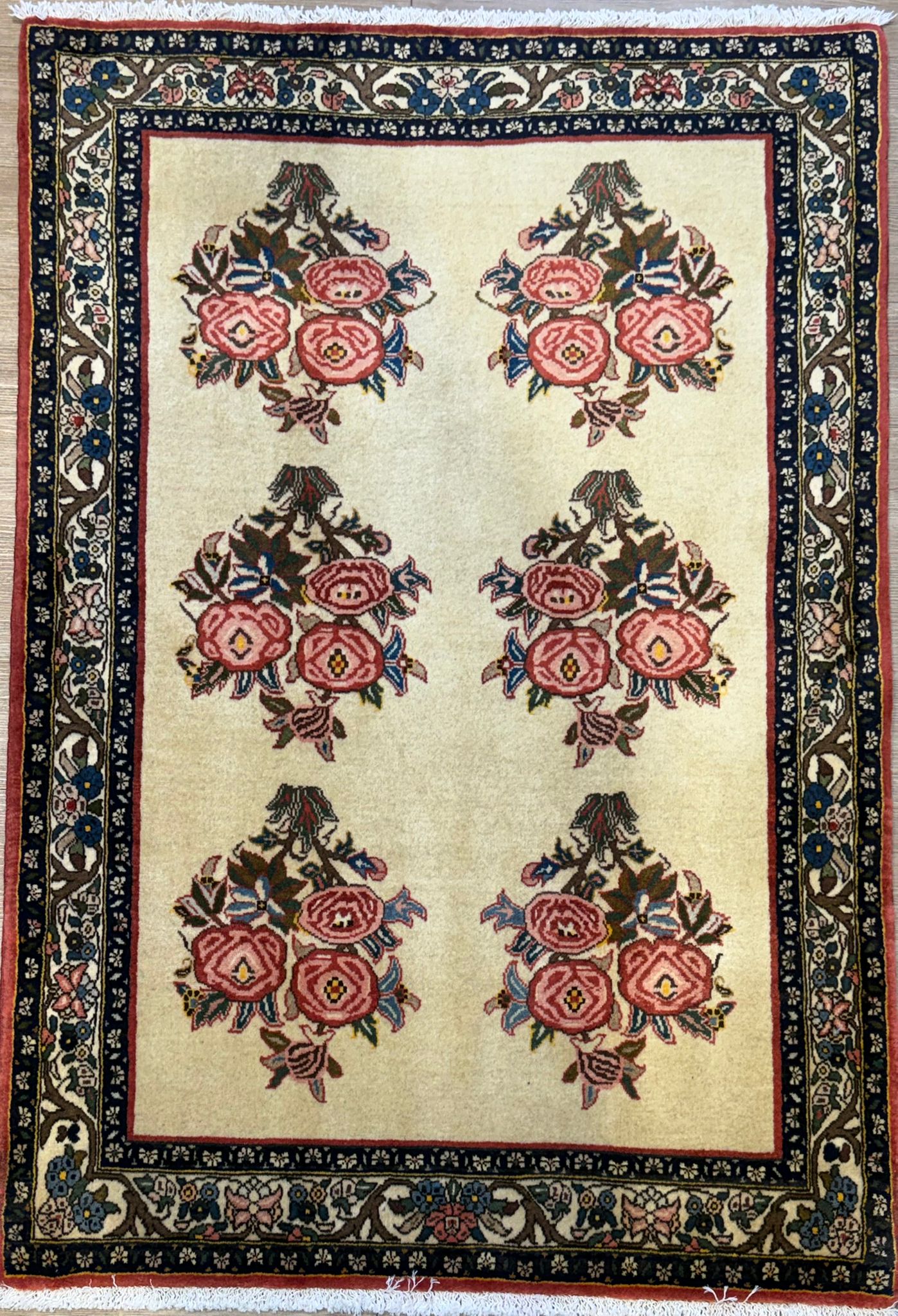 Elegant handwoven Persian Bakhtiari rug featuring six floral bouquets on a cream field,